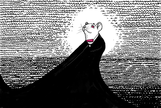 Jenna turned to us and smiled. She was white, with red eyes, indicating that she was an escaped lab mouse. Her brilliant fur was offset by a striking, short black cape and a black felt hat. A sharpened bobby pin was tucked into her black belt. She nodded her head to us. “It’s a pleasure.”