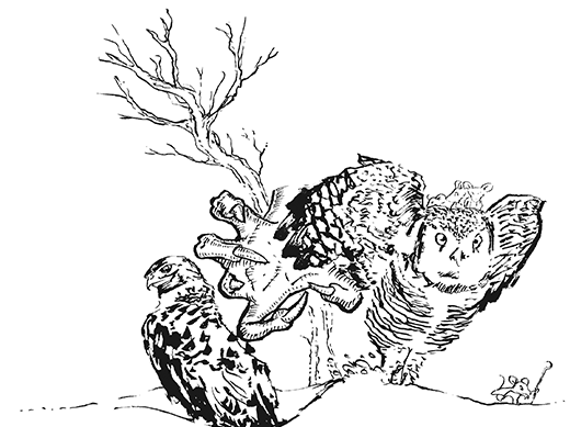 A hideous claw snatched a single feather from Bracey’s tail as she hopped through the weir, carrying us on her back. She spread her wings and flew a short distance away, shouting “Get back! Get back!”