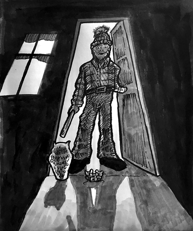 We heard someone moving inside, coming toward the door, so we dismounted and stood on the snowy stoop.
