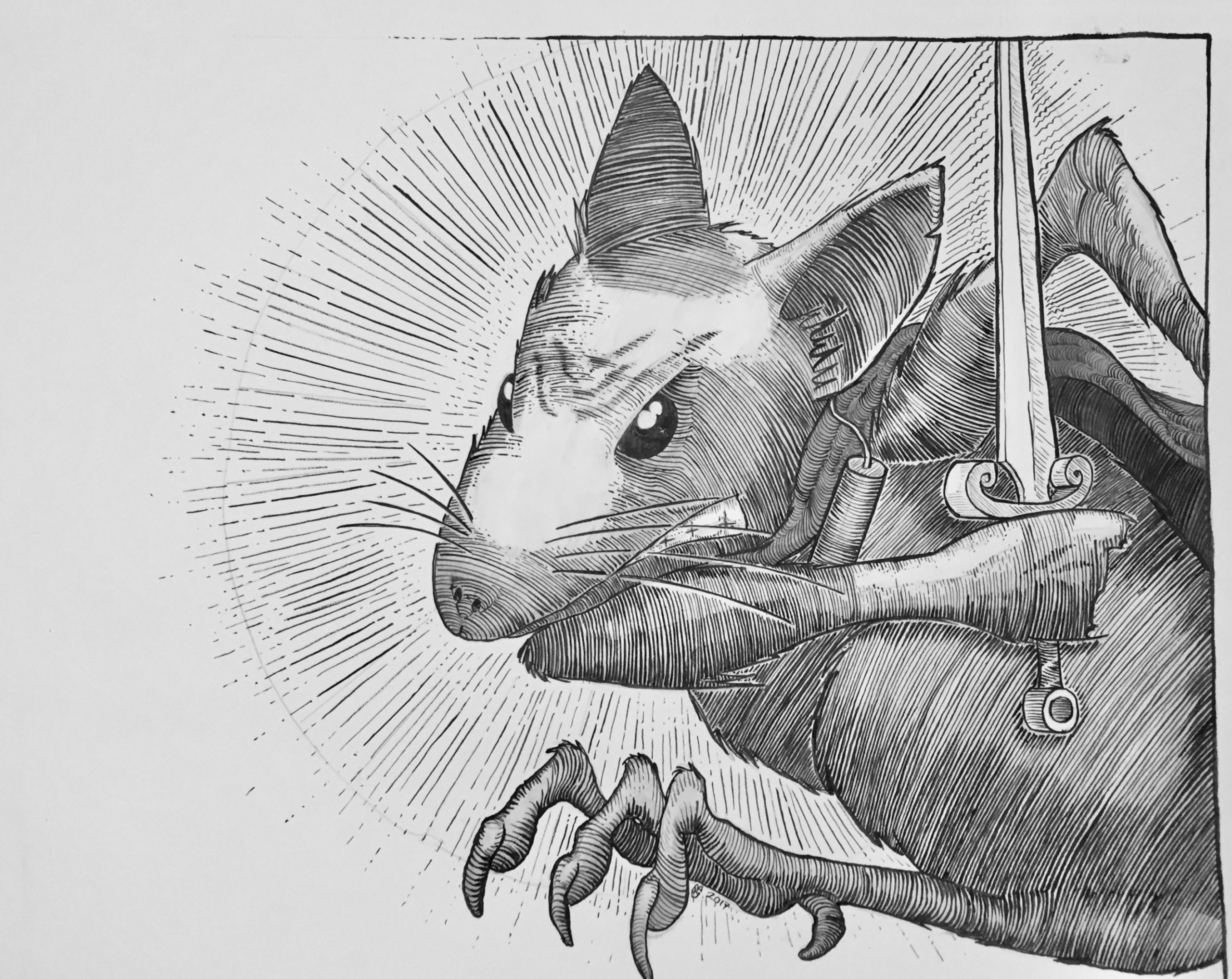 I landed on her. Taking pawholds on the bumps on her crustacean-like shell, I scampered up her back toward the base of her head. I held tight with my left paw and drew Grassblade with my right. My muscles shimmered with power from the enchanted pine nut I’d eaten, and my sword vibrated with power in my hands, hungry for fae flesh.