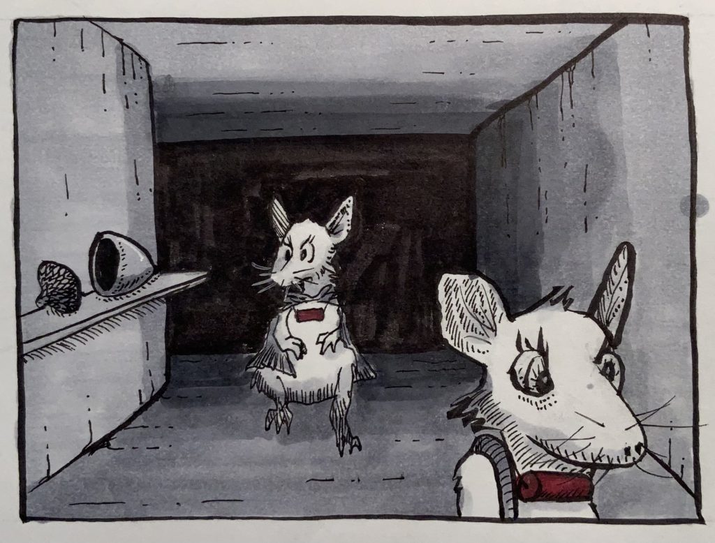The growing stench of charred paper filled the air as we approached the library. We walked in to find scattered, burned pieces of paper on the floor, and a few exhausted mice trying to clean up the mess. A black deer mouse perked up, shook ash from her whiskers, and called over to us. “You here to help?”