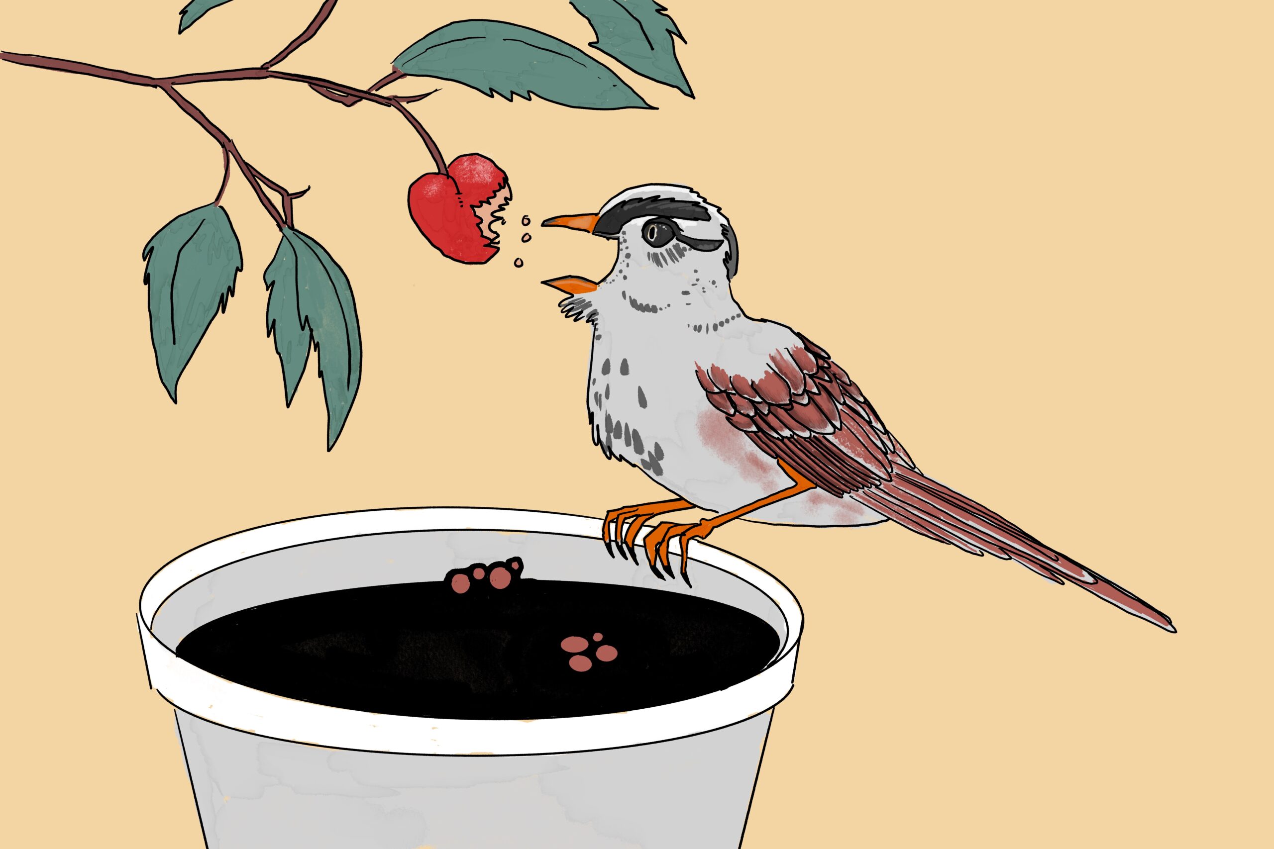 Another bird dropped down from the ceiling then, startling me. He poked his beak into the cherry and swallowed a bit of it. “It’s good!”