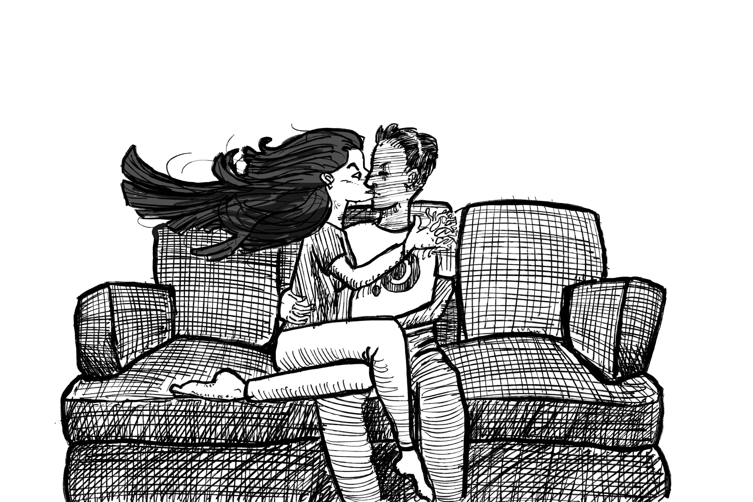 The two humans exchanged some pleasantries, and Josh put some coffee on. They sat on the couch together and were soon kissing.